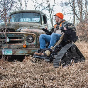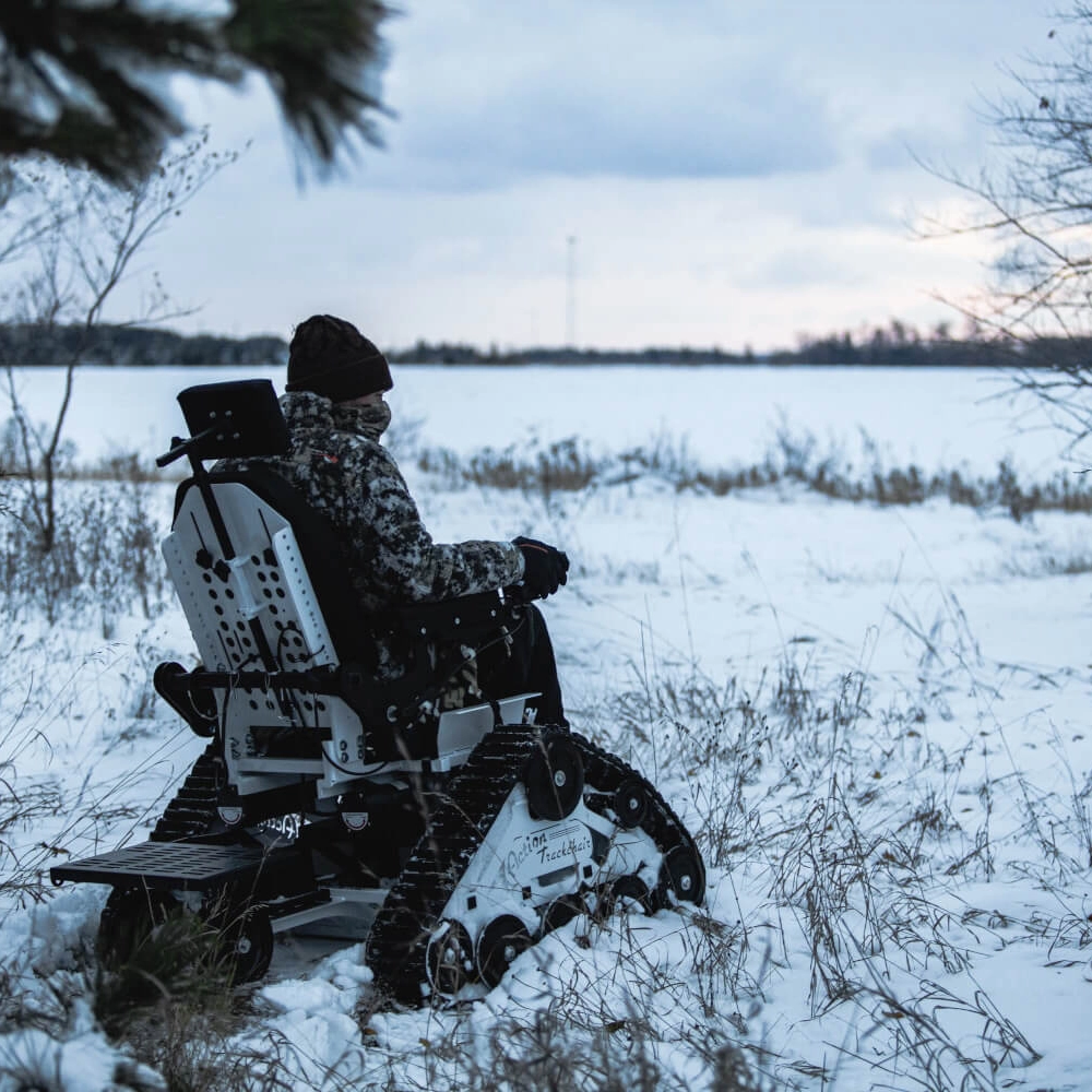 The Trackchair® STS includes the 20-amp battery charger, auxiliary tilt-on-the-fly mechanism, cushioned arm rests, fixed footrest (adjustable for height), Type I or Type II tracks, rear stability wheels, lap seatbelt, dual-port USB charger, battery charger plug-in port, independent flip-up arms, and a torsion arm suspension system with automatic track tensioning. A variety of upgrades and modifications are available. View the animations below to see tilting and arms lifting in action.