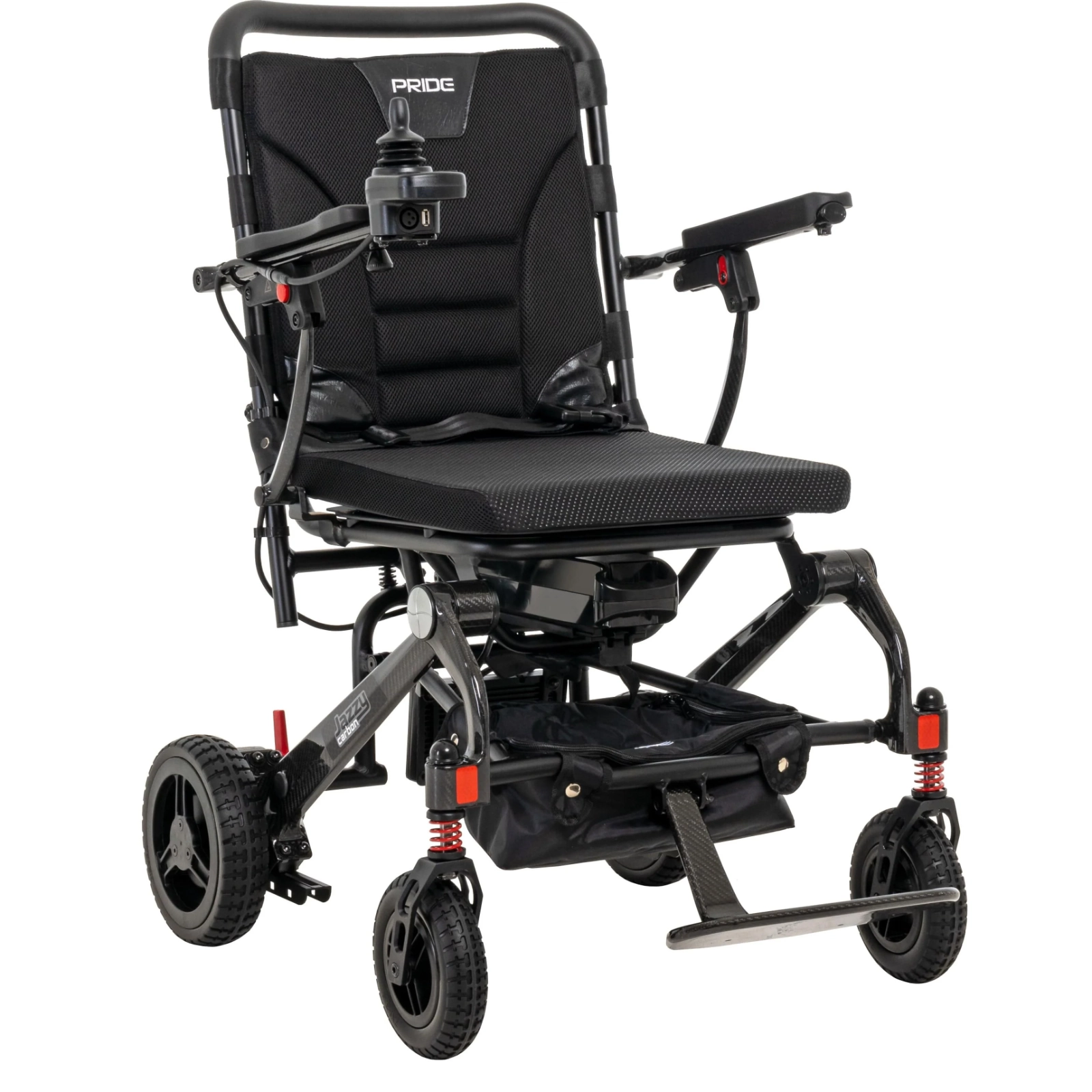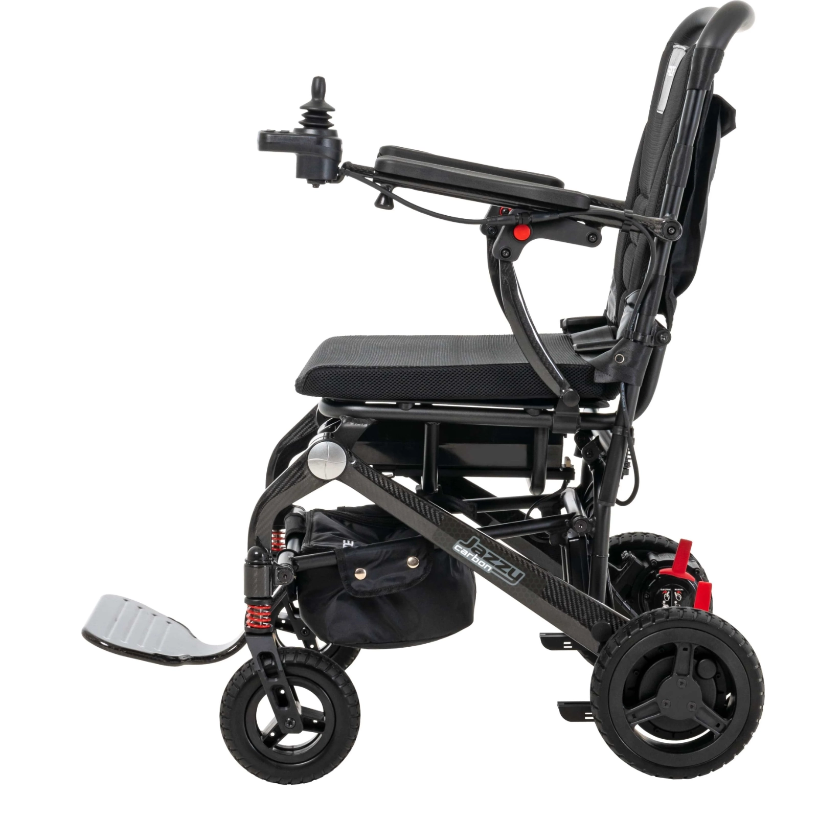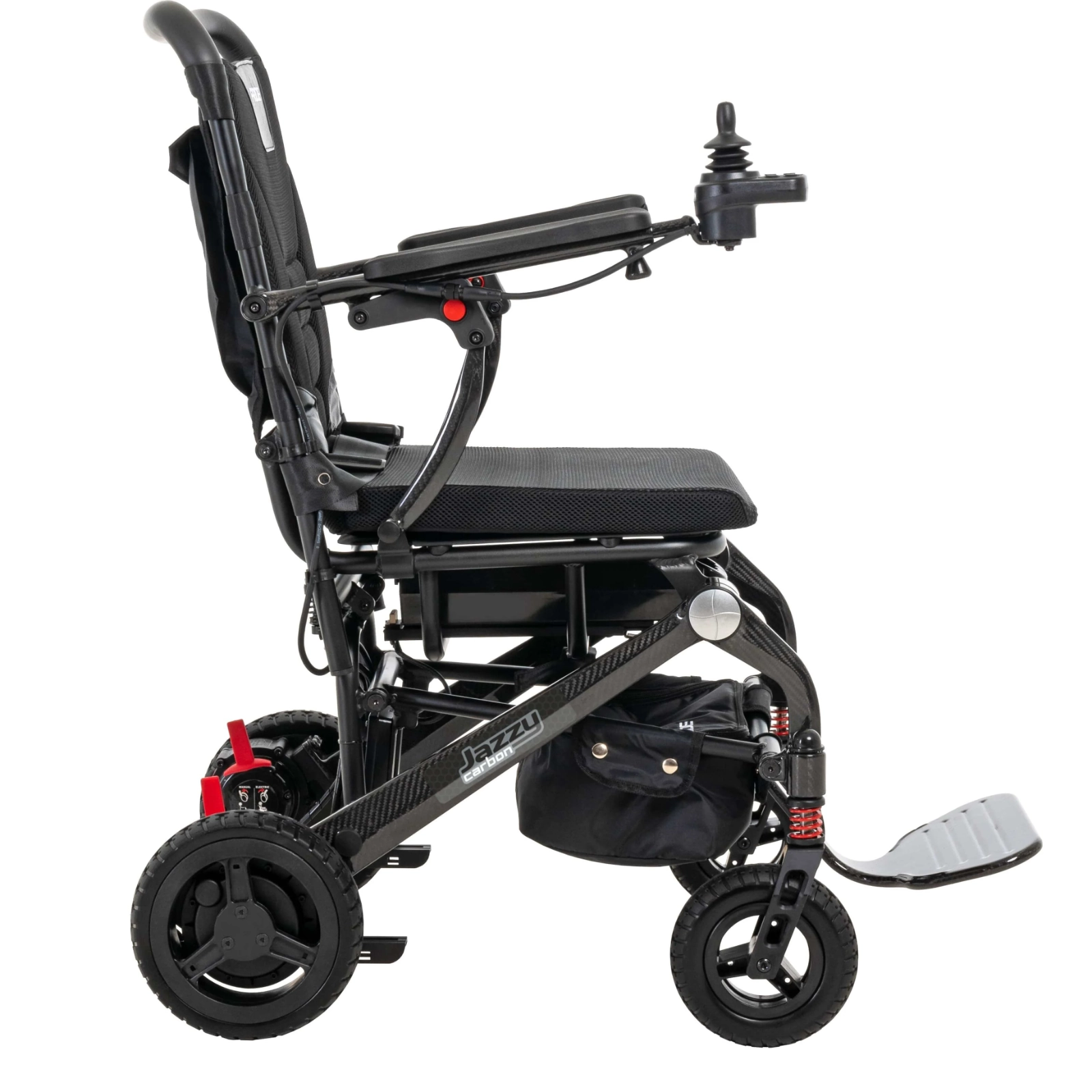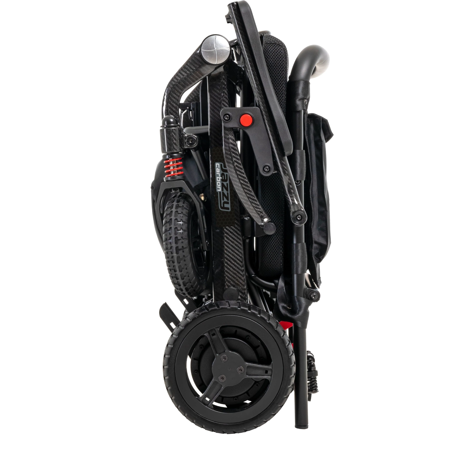 Jazzy Carbon folds down in just a few quick motions, which makes it easier to transport in cars, planes and trains. But don’t let portability fool you. Jazzy Carbon has tall, terrain-dominating wheels and a front-end suspension system, plus a comfy seat cushion to sustain you through everything your busy day throws at you.