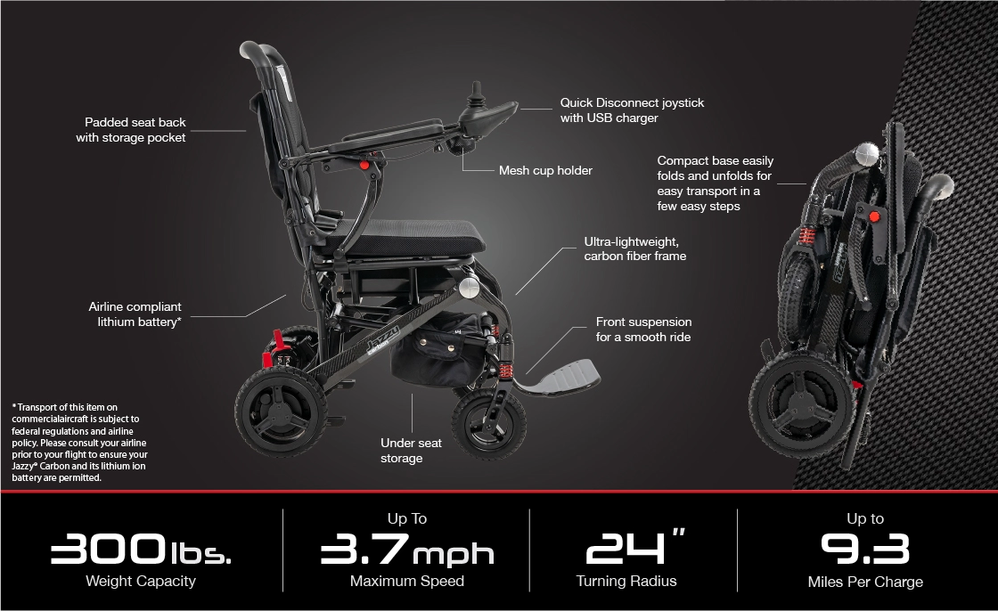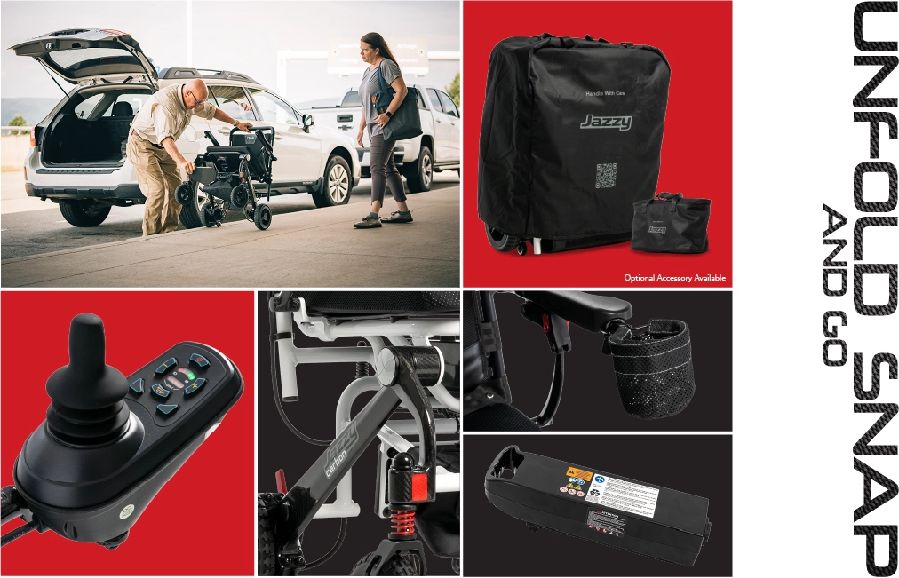 Jazzy Carbon gives you mobility and control to do it all. And now with the new Jazzy Travel Bag Kit, you can protect your unit from wear and tear throughout all your adventures, while enjoying another convenient option to transport your powerchair by towing it behind you like luggage.
