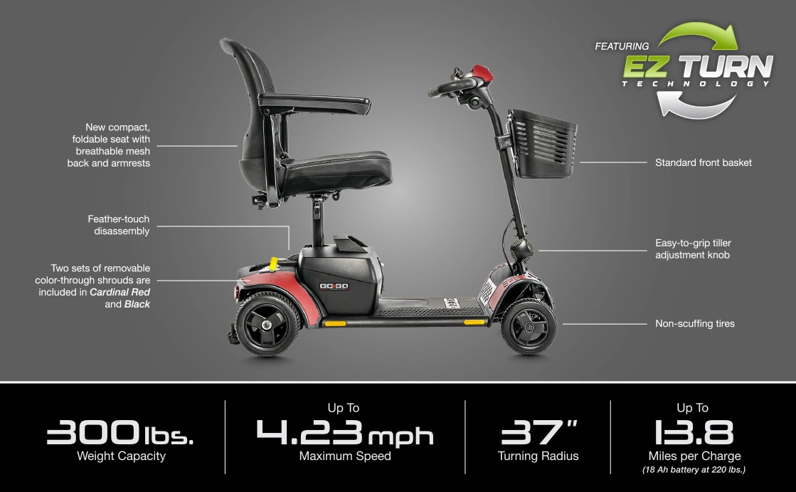 - Industry-leading 37” turning radius, incorporating Pride’s patented EZ Turn Technology.