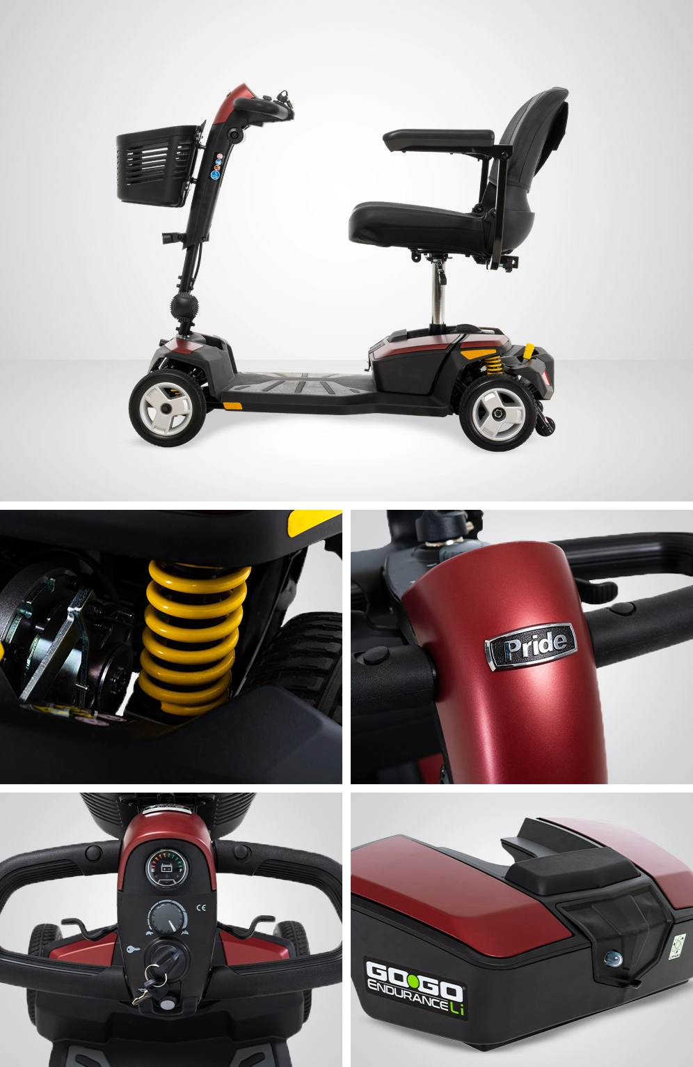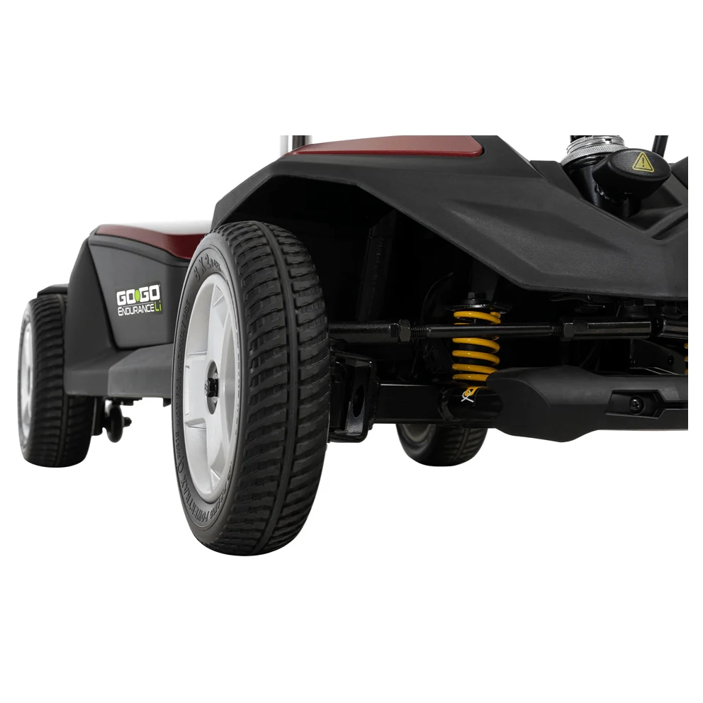 Since you’ll be riding further, the Go Go Endurance Li includes Pride’s Comfort-Trac Suspension with powerful coil springs at each tire. You can endure more varied terrain on 8-inch, non-marking tires. The Go Go Endurance also offers a weight capacity up to 325 pounds.