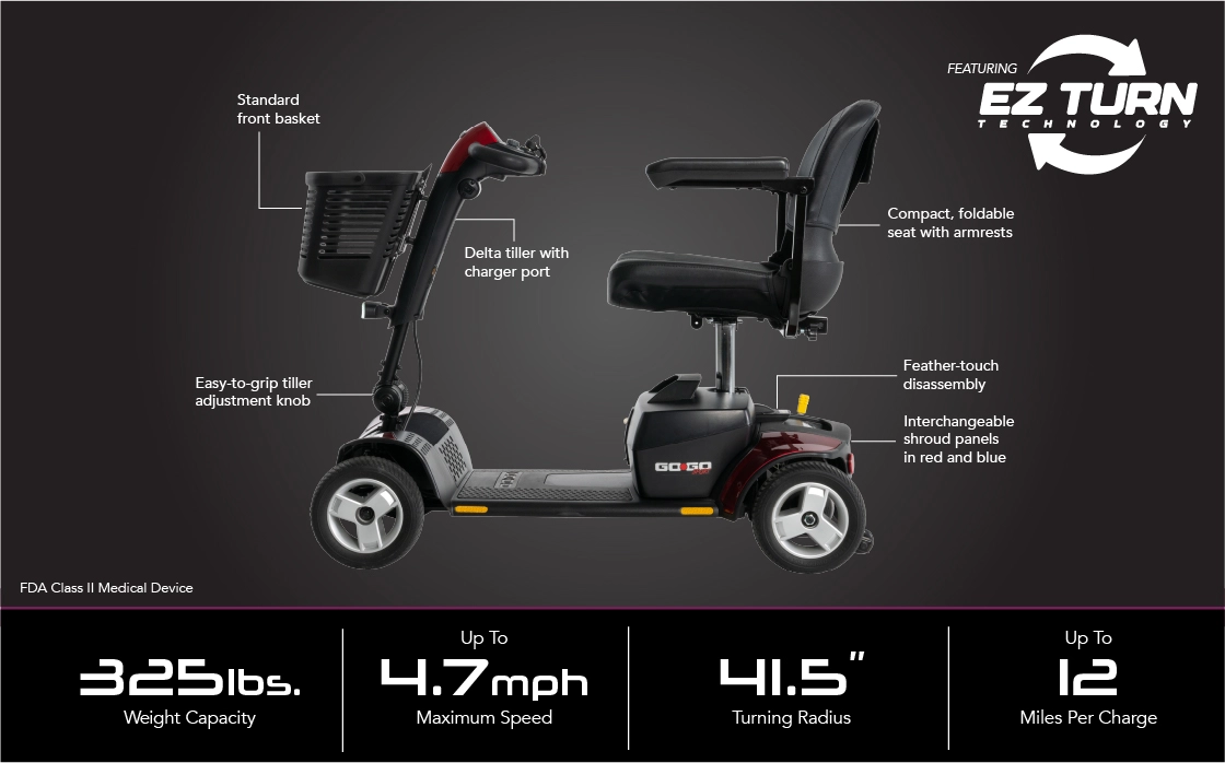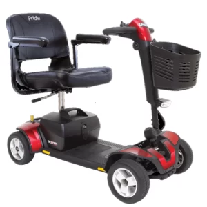 - 41.5” turning radius thanks to Pride’s exclusive EZ Turn technology that allows for 3-wheel scooter turning ability while maintaining 4-wheel stability