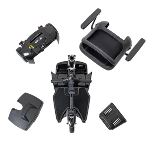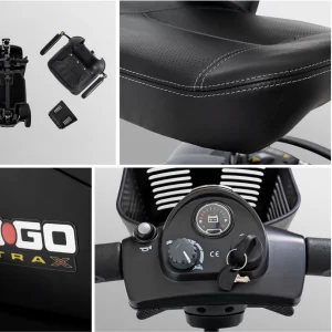 The Go Go Ultra X 4-Wheel and its counterpart, the Go Go Ultra X 3-Wheel, use Pride’s compact, folding seat design. The vinyl seat and armrests offer the kind of sustaining comfort that let you ride all day and quit when you’re ready.