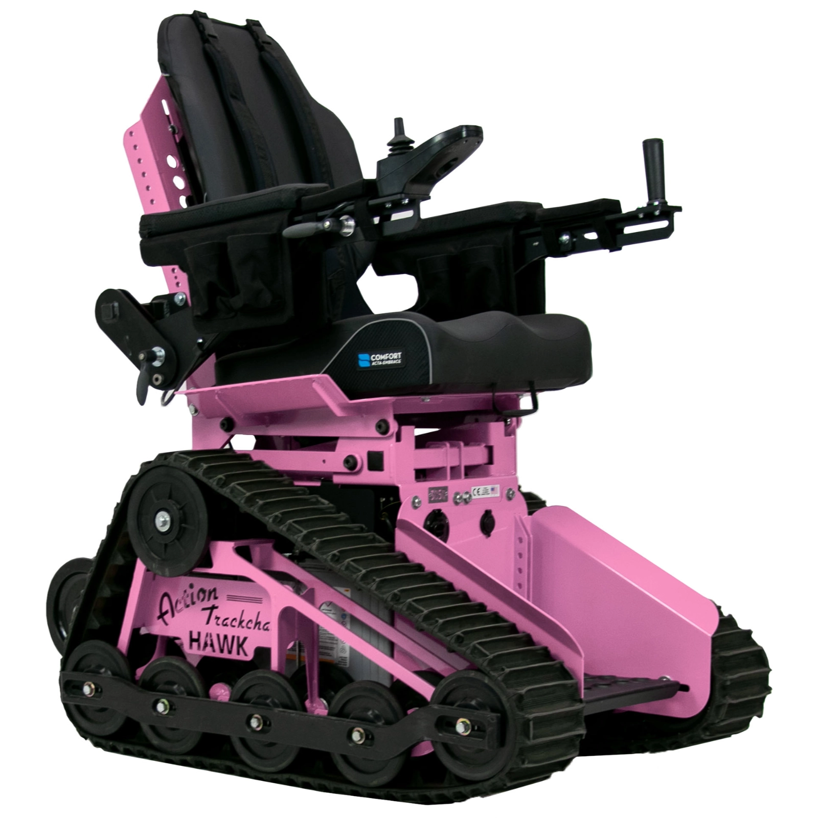The Trackchair® HAWK series is a sleek unit that is only 29 1/2″ wide so it can take you almost anywhere! Drive it into your van and venture off to sporting events, shopping and so much more. The key to this revolutionary new design is “versatility through adjustability”. Armrests adjust both up/down as well as in and out and they also flip up to aid in transferring. The seat back cushion can be re-positioned up/down and the entire backrest can be moved fore and aft. These unique adjustments are there to suit your individual needs. With dozens of color combinations and accessories, five different sizes, and a variety of modifications available, each Trackchair® can be customized to fit your needs.